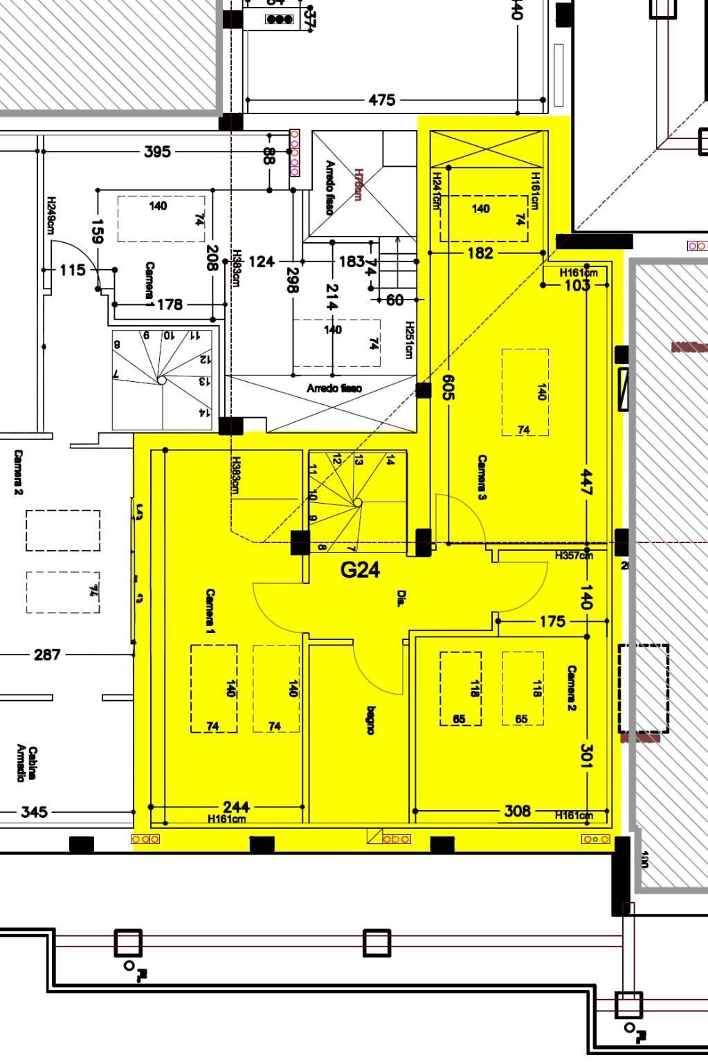 - piano terzo (sottotetto) caratterizzato dalle grandi altezze anche superiori ai 3 metri e dalle splendide travi a vista, composto da 3 camere da letto, cabina armadio e secondo bagno con doccia.
