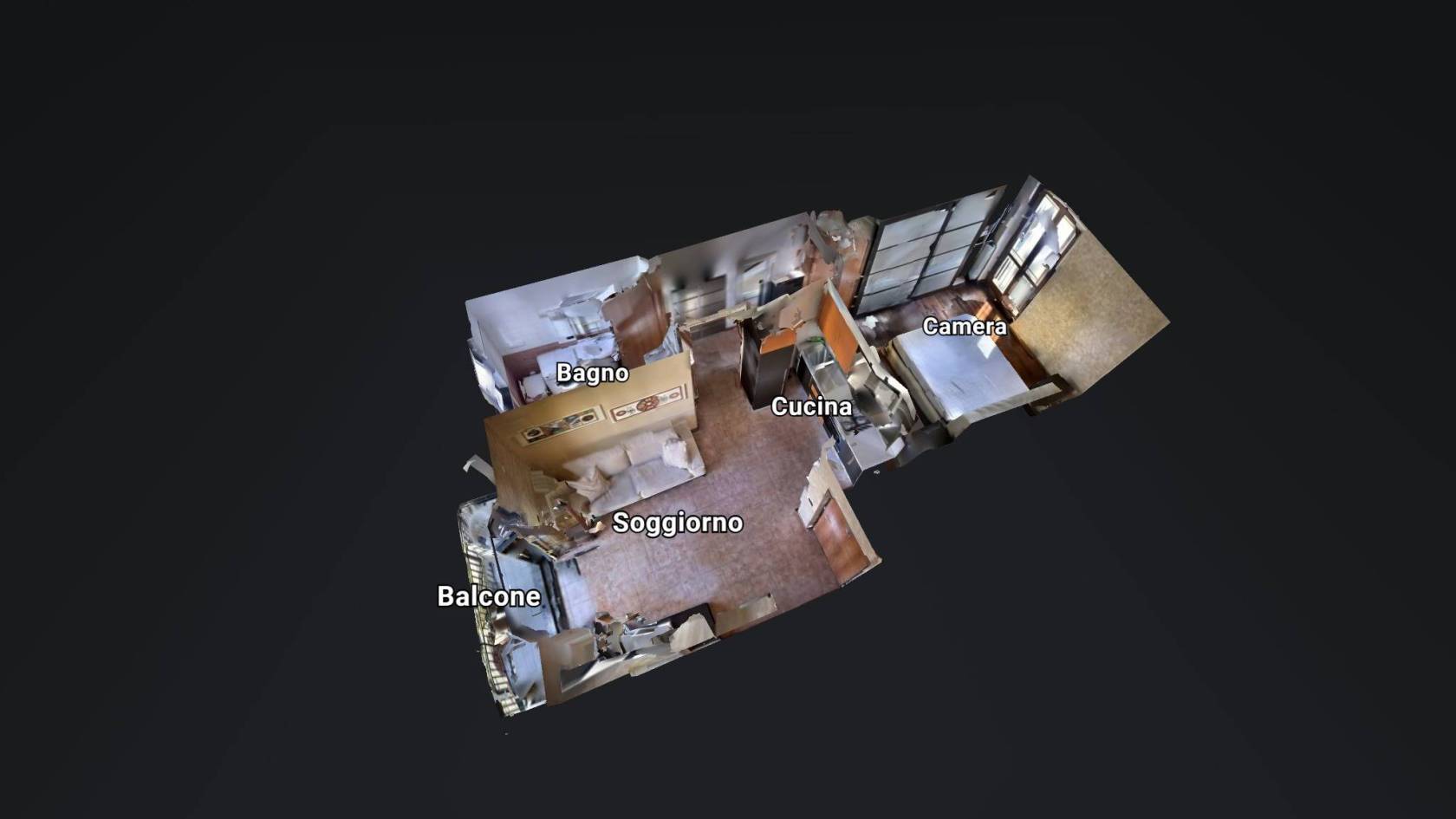 La distribuzione attuale prevede soggiorno con affaccio sul balcone interno ed angolo cottura, un bagno finestrato, un disimpegno ed una camera.